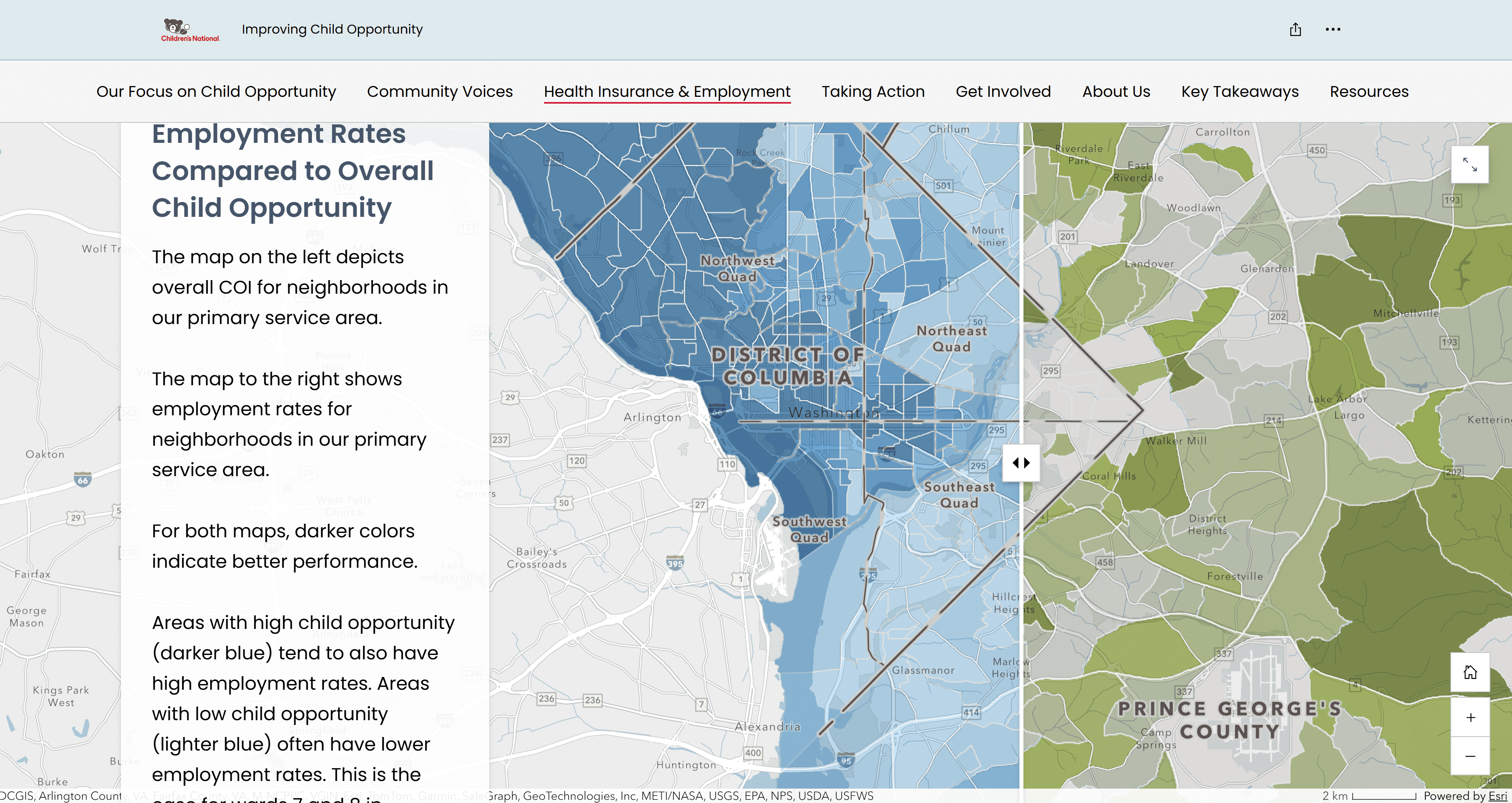 Children's National, a hospital serving the greater D.C. and Prince George’s County areas, wanted to display their annual research about child opportunity using spatial views that would connect with residents and increase engagement.