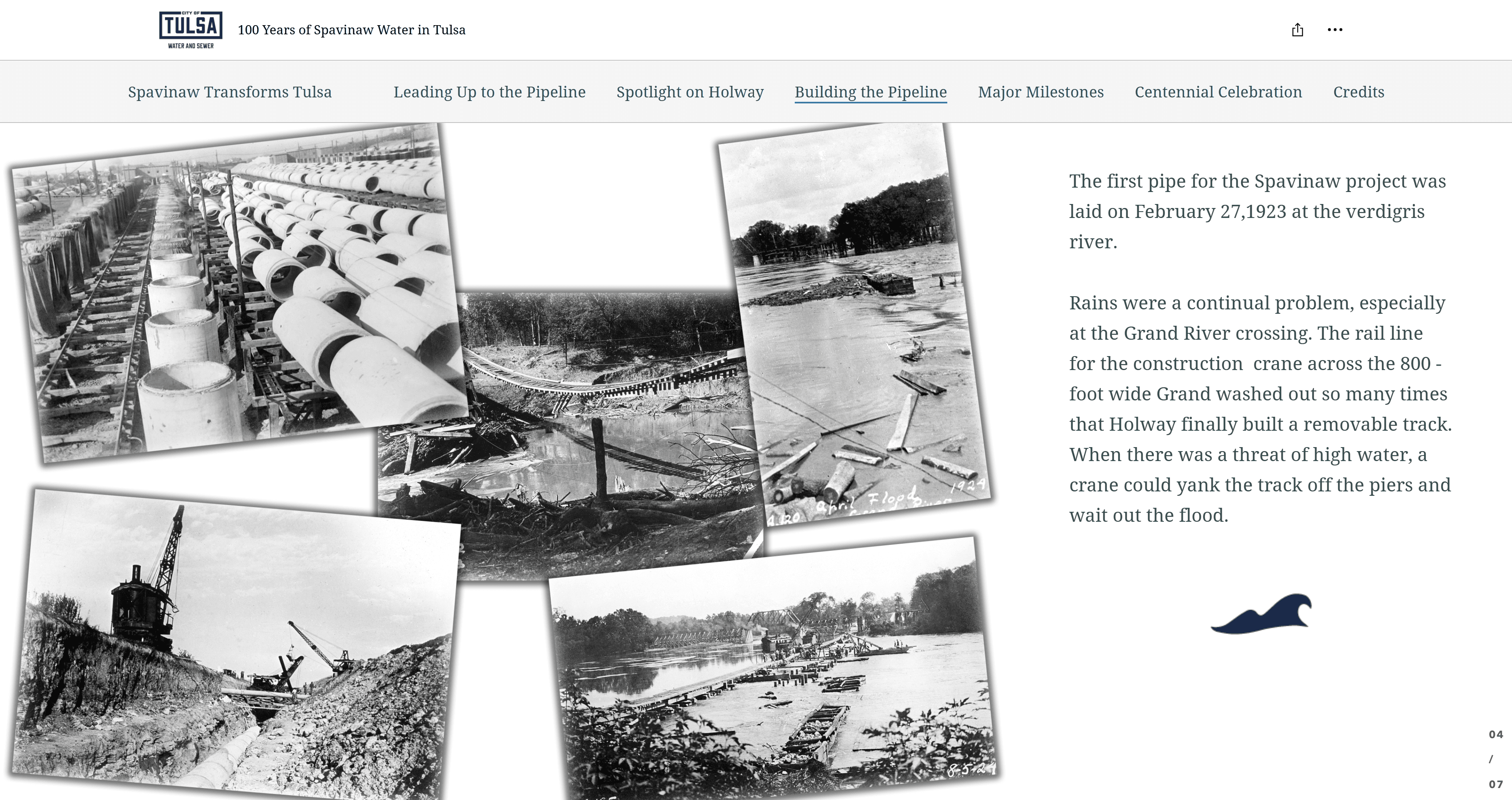 To celebrate the centennial anniversary of the completion of the Spavinaw pipeline in Oklahoma, the City of Tulsa commissioned us to create a site detailing the rich history of the pipeline. They had a wealth of photos, diagrams, and videos related to the pipeline. This project was a joy to work on because of the surplus of media I had available and the full creative freedom they handed me.
